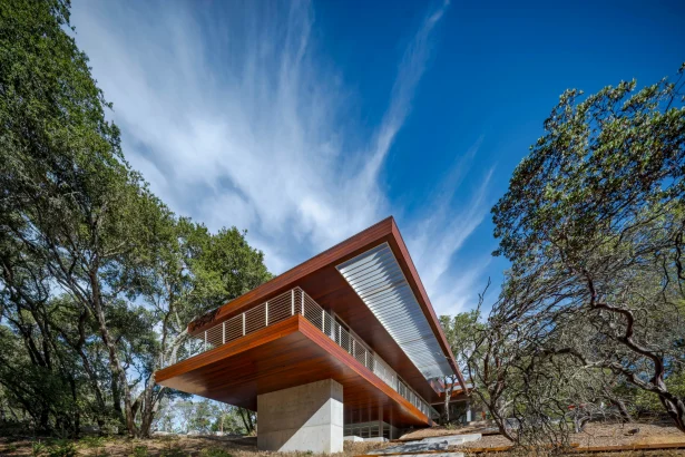 Na szczytowej parceli o powierzchni 38 akrów, porośniętej dębami, sekwojami, wawrzynami i drzewami madrone, górującej nad okolicznymi winnicami, powstała wyjątkowa posiadłość nazwana Whispering…