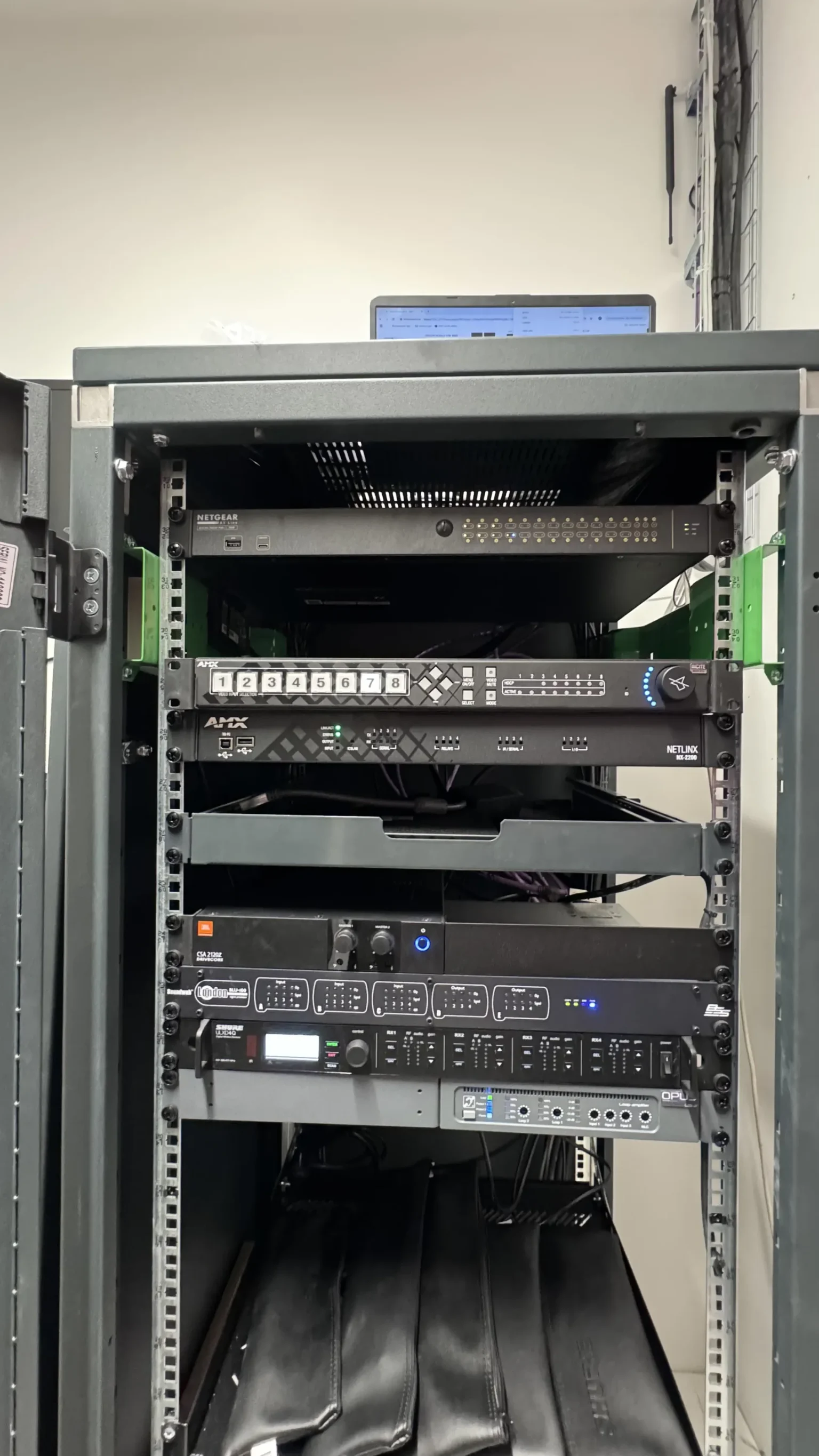 - Odbiorniki i panele ścienne: AMX DX-RX-4K60, AMX DX-TX-DWP-4K-BL (13 szt.).