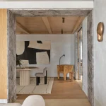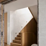 Wnętrza cechuje monochromatyczna paleta z bogatymi fakturami. Ograniczona wysokość stropów skłoniła projektantów do skupienia się na detalach wykończenia i geometrycznym układzie pomieszczeń. Stalowe belki, podpierające nowe otwory, zostały obudowane drewnem, dodając wnętrzom ciepła.
