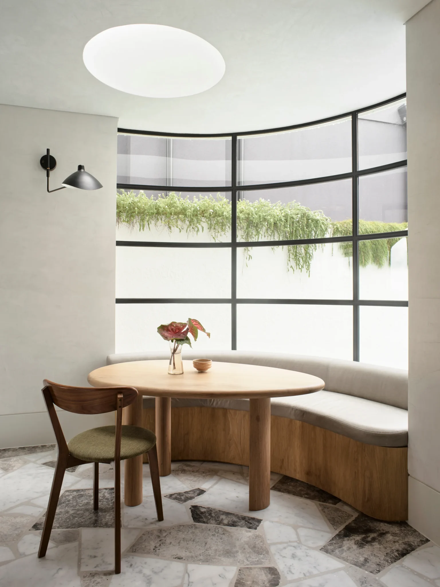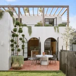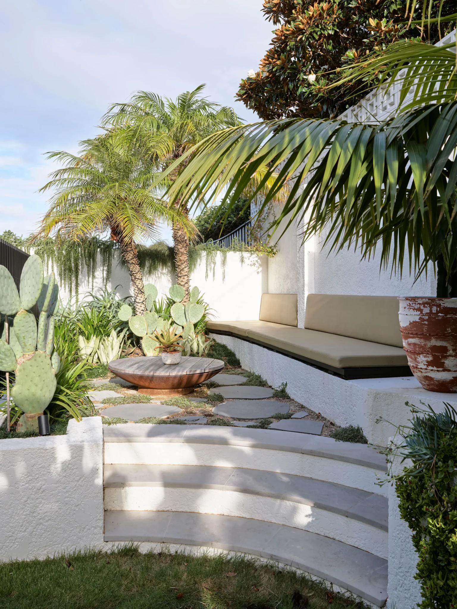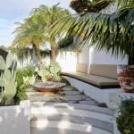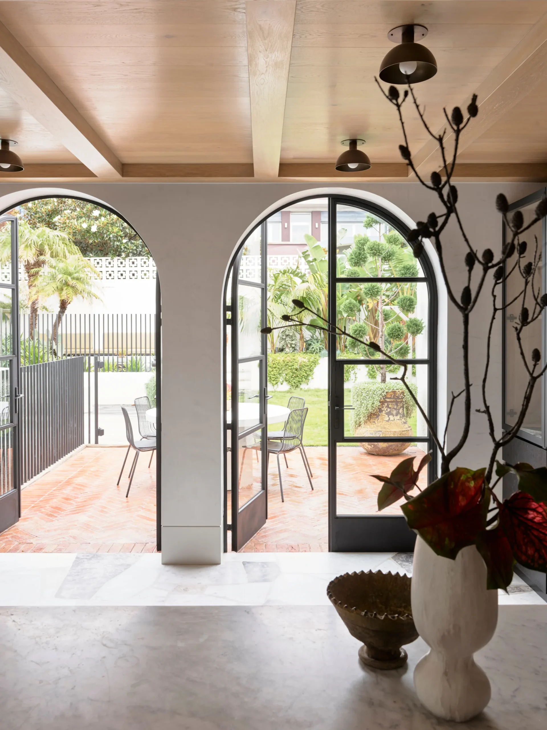 Elewacja Pacific House to połączenie białych, teksturalnych powierzchni z bujną zielenią. Nowe detale, takie jak zaokrąglone drzwi na rogach, nadają budynkowi bardziej miękki i przyjazny charakter. Pomimo zachowania niektórych elementów stylu z lat 90., dom nawiązuje do śródziemnomorskiej estetyki – monolityczna bryła stapia się z zielonymi pnączami.