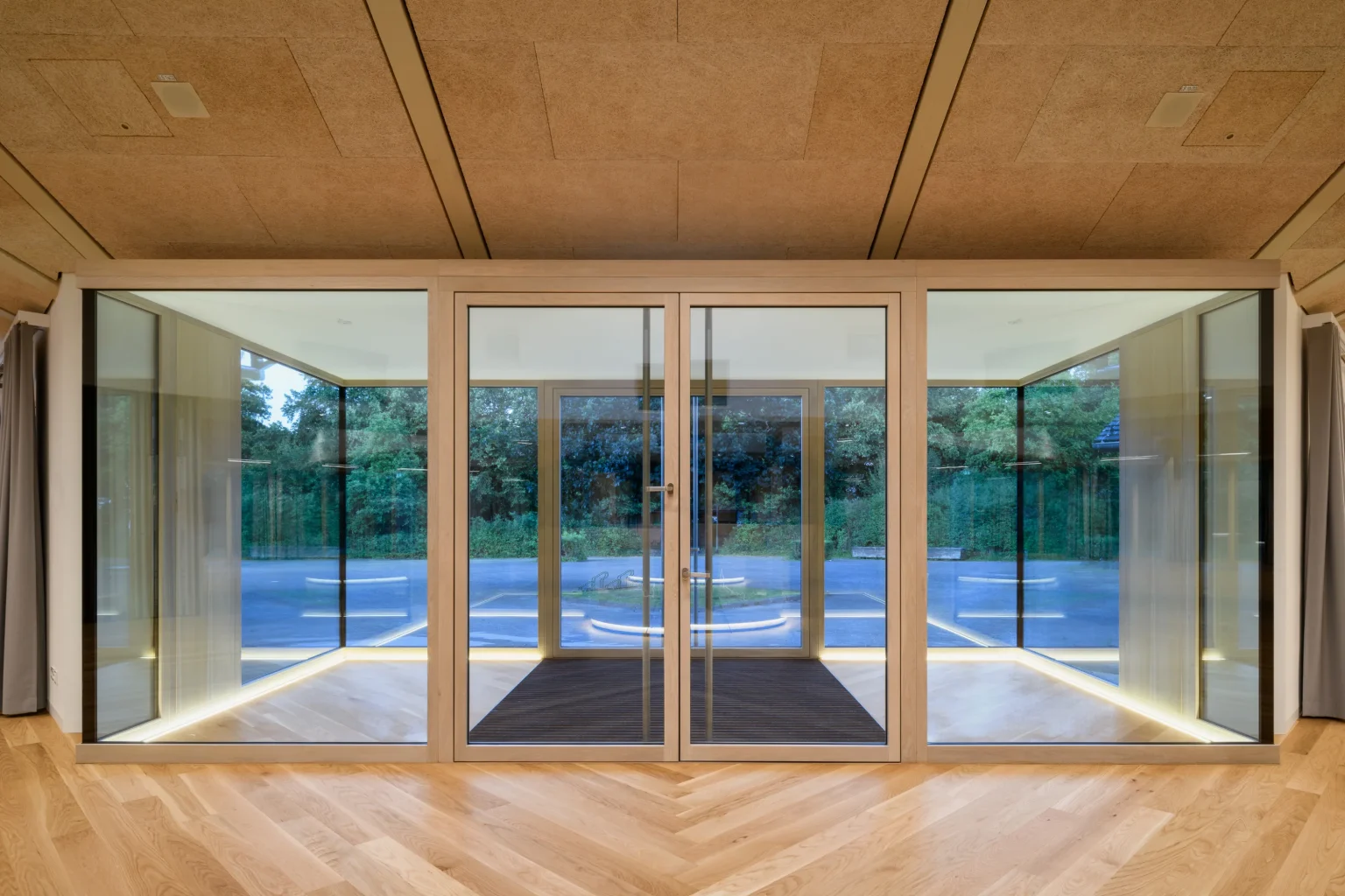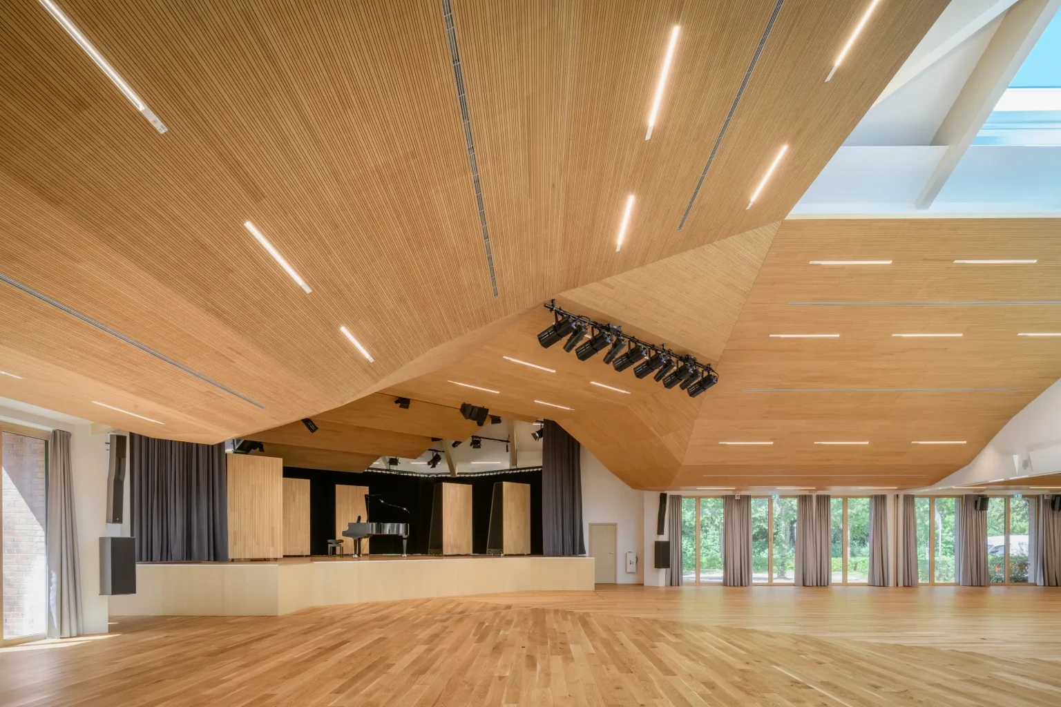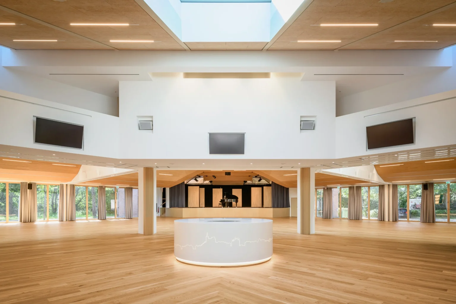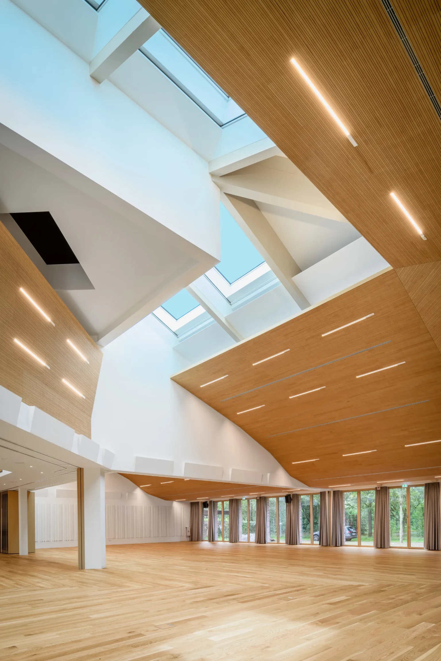 W głównej sali zaprojektowano kunsztownie wykonany, akustycznie skuteczny drewniany sufit z wpuszczanym oświetleniem LED i zintegrowaną wentylacją. Całość połączono w sposób harmonijny, zapewniając równowagę między oświetleniem, akustyką a systemami klimatyzacji. Dodatkowo utworzono cztery nowe sale konferencyjne – nad główną salą i w piwnicy. Budynek dostosowano także do najnowszych standardów energetycznych, m.in. dzięki zastosowaniu izolacji z wełny mineralnej i ogrzewania sieciowego.